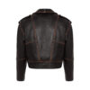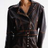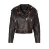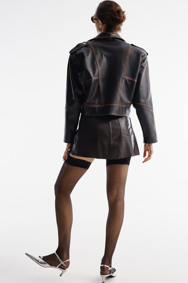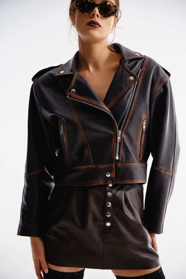 Skórzana kurtka typu ramoneska wykonana z naturalnej skóry owczej w kolorze ciemnego brązu z konturowaniem vintage.