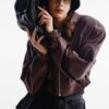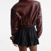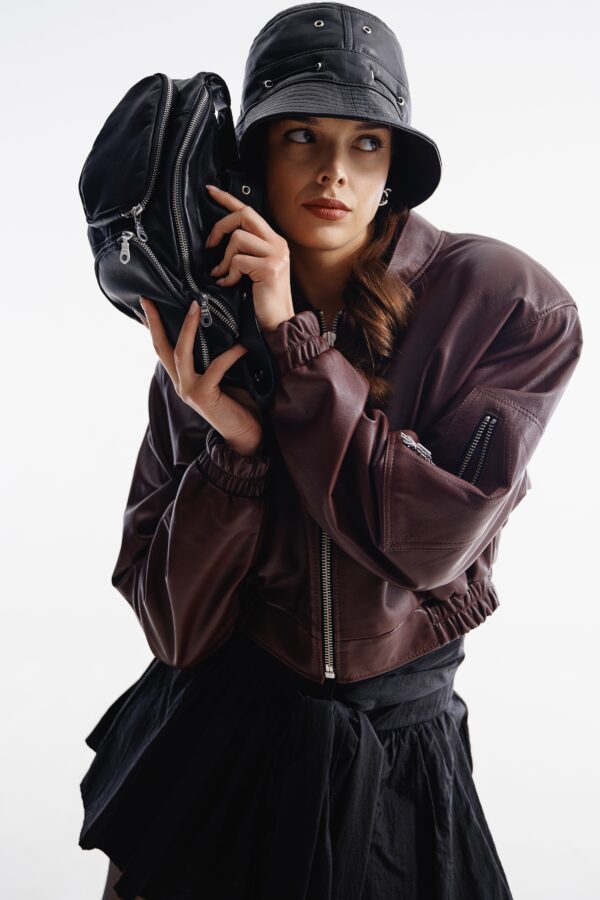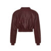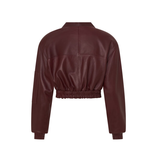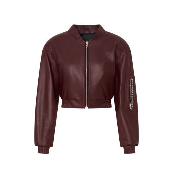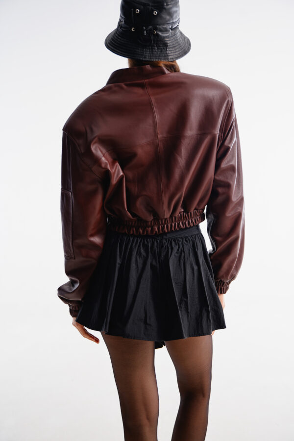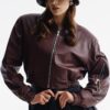 Skórzana kurtka typu bomber o oversize’owej linii wykonana z naturalnej skóry owczej w kolorze burguntowym.