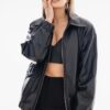 Skórzana kurtka typu bomber o oversize’owej linii wykonana z naturalnej skóry owczej w kolorze ponadczasowej czerni.
