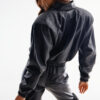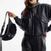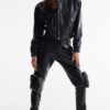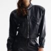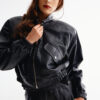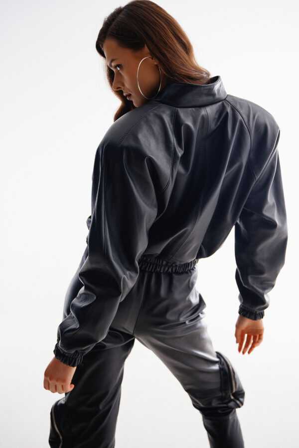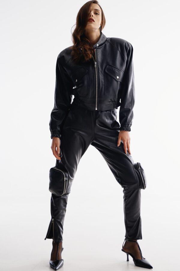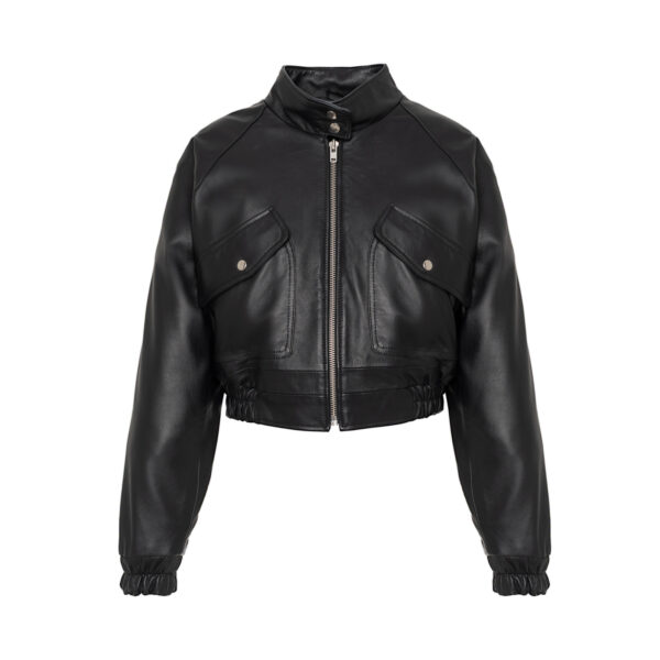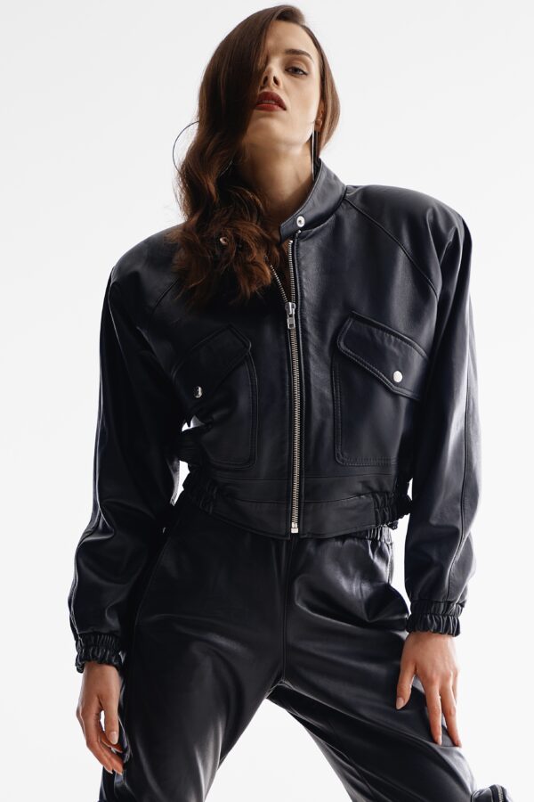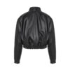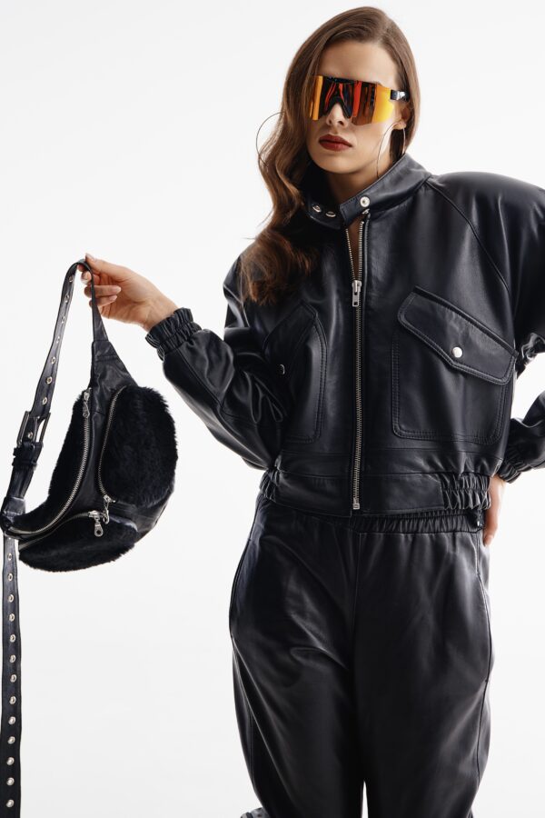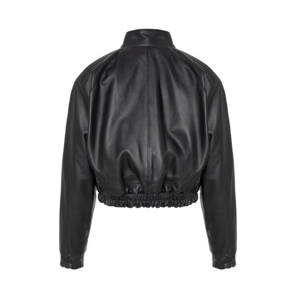 Skórzana kurtka typu bomber o oversize’owej linii wykonana z naturalnej skóry owczej w kolorze głębokiej czerni.