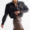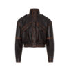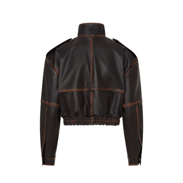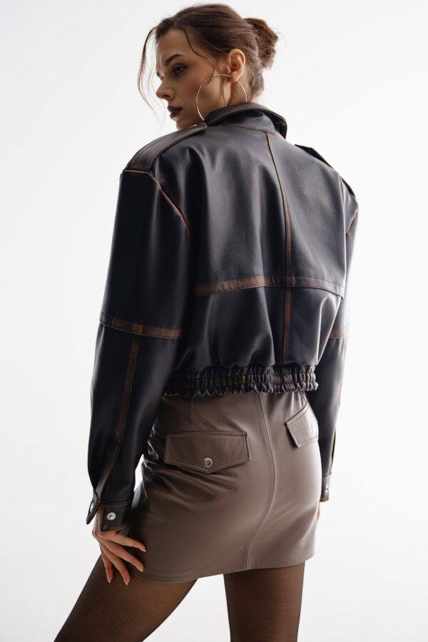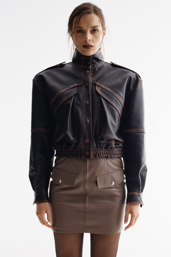 Skórzana kurtka typu bomber o oversize’owej linii wykonana z naturalnej skóry owczej w kolorze ciemnego brązu z konturowaniem vintage.