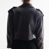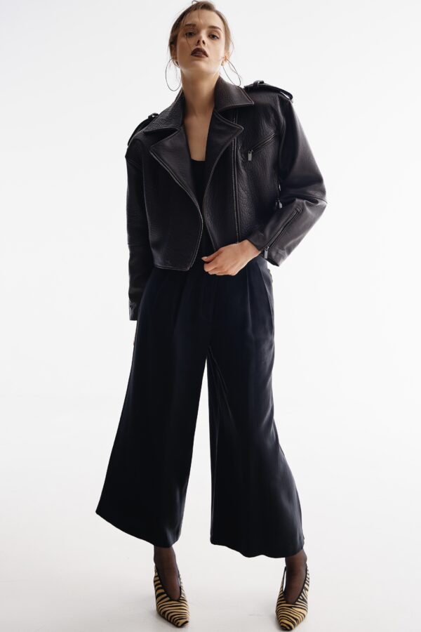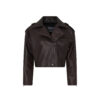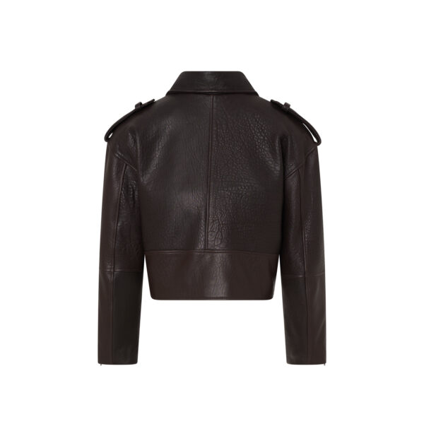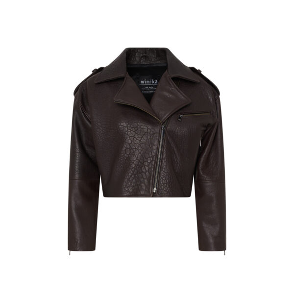 Skórzana kurtka typu ramoneska wykonana z naturalnej skóry owczej w kolorze ciemnego brązu z teksurowym finiszem.